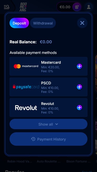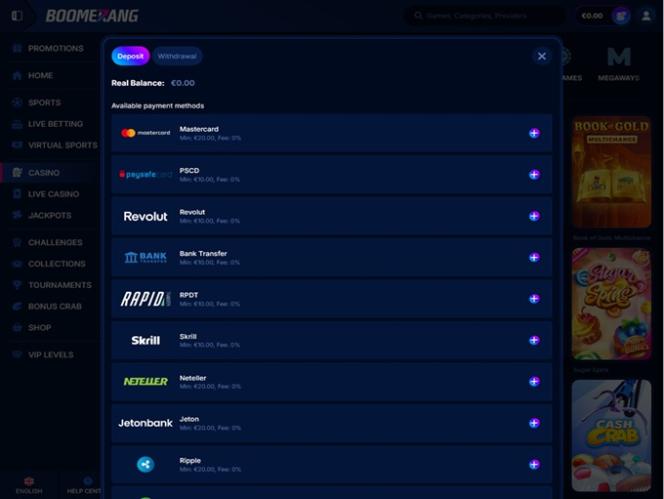 أما فيما يتعلق بطرق الدفع، فإنّ Boomerang Bet لا تخيب الآمال أيضاً، إذ تُقدّم باقة واسعة من خيارات الدفع المختلفة. فإلى جانب خيارات الدفع الشائعة كالمحافظ الإلكترونية وبطاقات البنوك، يُمكنك أيضاً استخدام العديد من العملات الرقمية مثل بيتكوين، دوجكوين، USDT، وغيرها الكثير!