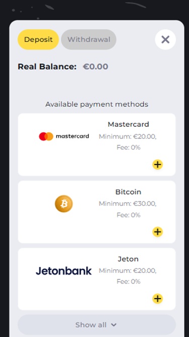 Boomerang هوكازينو على الإنترنت يدعم العملات المشفرة ، كما تتوفر أيضًا طرق دفع أخرى مثل بطاقات الدفع والمحافظ الإلكترونية والمعاملات البنكية.
