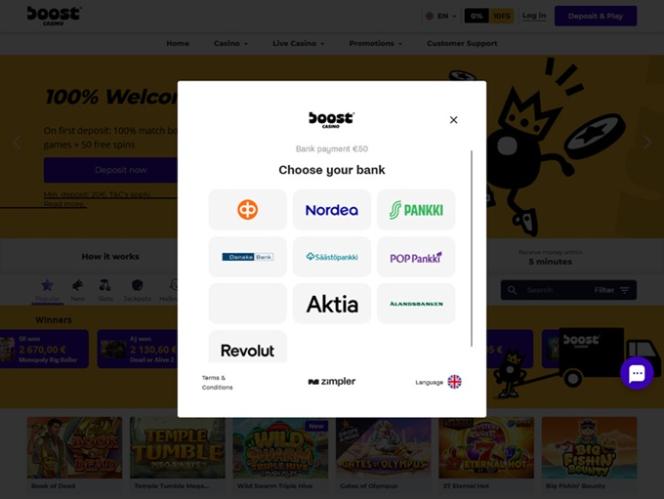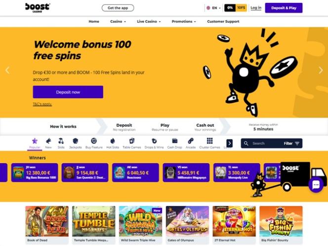 يحتوي كازينو Boost أيضًا على قسم للموزع المباشر، والطريقة التي يتم بها تصنيف الألعاب بشكل عام توفر تجربة تصفح سهلة للغاية، وتفصل العناوين الجديدة والألعاب ذات الجوائز الكبرى في فئة مستقلة.