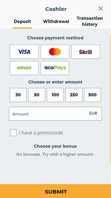 النظام المصرفي ممتاز، حيث تتم معالجة عمليات الإيداع والسحب عبر Neteller وSkrill وVisa والتحويل البنكي. كما يمكن الإيداع عبر MasterCard وSOFORT وPaysafecard وGiropay وPoli وiDeal وTrustly وWebMoney. تتم معالجة المدفوعات في أي وقت بين بضع دقائق و48 ساعة، مع حد أقصى للسحب يبلغ 7,000 يورو أسبوعيًا أو 10,000 يورو شهريًا.