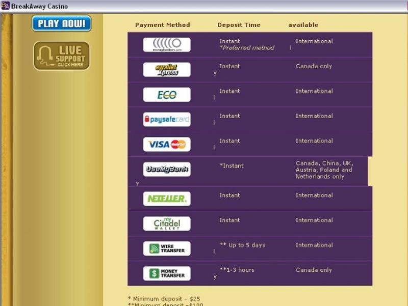 يعتمد Break Away Casino على Rival ، والذي يتيح للاعبين الوصول إليه من خلال برنامج قابل للتنزيل.خيارات الخدمات المصرفية في Break Away Casino