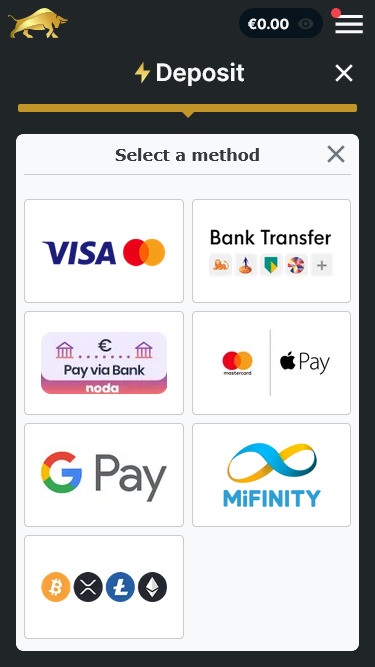 يمكنك استخدام عدة طرق دفع للإيداع والسحب هنا. للطريقة التقليدية، يوفر المشغل خيارات شائعة مثل فيزا ، وماستركارد ، والتحويل البنكي، وآبل باي ، وجوجل باي ، وماي فينيتي ، ونودا باي ، وريفولوت . في الوقت نفسه، تشمل الطرق الحديثة العملات المشفرة مثل بيتكوين ، وإيثريوم ، ولايتكوين ، وريبل .