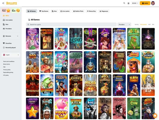 الفئة الأكثر انتشارًا في Bulletz هي ماكينات القمار على الإنترنت. يستضيف المشغل أكثر من أربعة آلاف لعبة ماكينات قمار، وسيتمكن اللاعبون من تجربة ألعاب مميزة، بما في ذلك Megaways وBonus Buys...