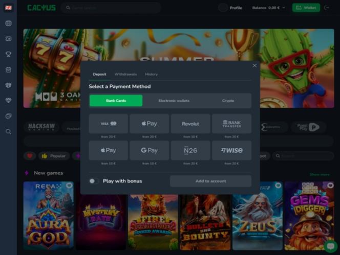 يقبل كازينو كاكتوس طرق دفع متنوعة للإيداع والسحب، بما في ذلك فيزا ، وماستركارد ، والتحويل البنكي ، وآبل باي، وجوجل باي ، وجيتون ، وغيرها. بالإضافة إلى ذلك، يمكنك استخدام العديد من العملات المشفرة لإدارة أموالك، بما في ذلك بيتكوين ، وبيتكوين كاش ، ولايتكوين ، وتونكوين ، وترون ، و USD Coin ، وتيثر .