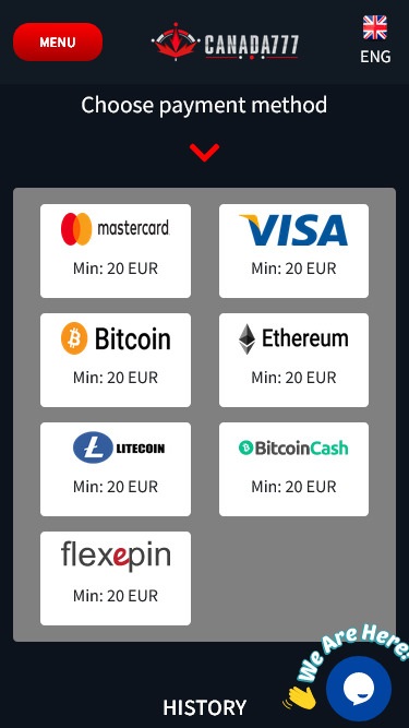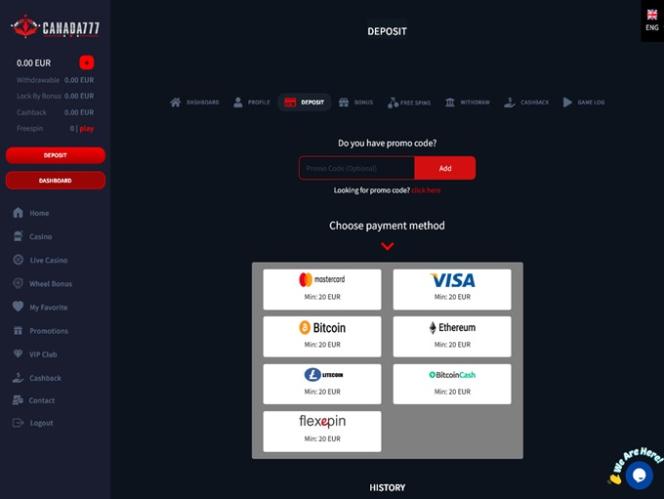 في كازينو Canada777، سيتمكن اللاعبون من استخدام بيتكوين وغيرها من العملات المشفرة الشائعة، لذا في حال تحولكم إلى المقامرة بالعملات المشفرة، يمكنكم الاعتماد على سرعة فائقة في الإيداع والسحب . كما يمكن للمقامرين إجراء التحويلات البنكية، واستخدام بطاقات الدفع، أو أنظمة الدفع الإلكترونية الأخرى.