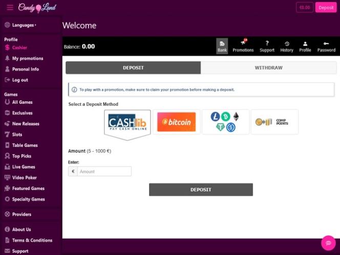 يُعد كازينو CandyLand علامة تجارية رائعة للمقامرة للاعبي الولايات المتحدة الأمريكية، ولكن يتم أيضًا دعوة المقامرين الدوليين الآخرين للانضمام إلى هذا الكازينو عبر الإنترنت الصديق للعملات المشفرة.