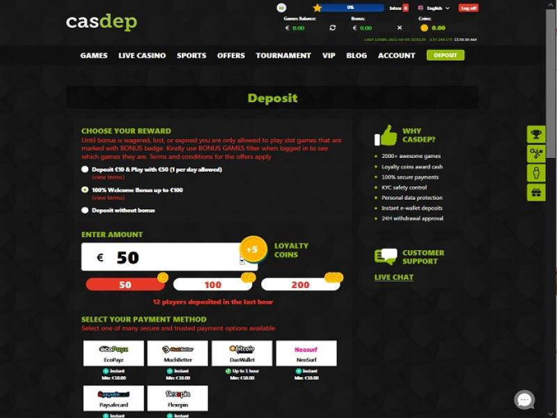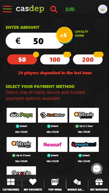 يتم تشغيل كازينو Casdep بواسطة Microgaming, Net Entertainment, 1x2gaming, Amatic Industries, Big Time Gaming, ELK Studios, Evolution Gaming, Ezugi, iSoftBet, Oryx, playson, Quickspin, Relax Gaming, SOFTSWISS, Thunderkick, Yggdrasil, Endorphina, Wazdan, Betgames, Booming Games, Stakelogic, Pragmatic Play, Nolimit City, Felt Gaming, Red Tiger Gaming, Red Rake Gaming, Fantasma Games, Kalamba, Revolver Gaming, Skywind, Spinmatic, Spadegaming, BGAMING, Northern Lights Gaming, Electric Elephant Games, Pocket Games Soft, Bulletproof Games, Gluck Games, Slot Factory, Spearhead Studios, Swintt, HungryBear Gaming, Blue Guru Games, Lady Luck Games, Games Global, Amusnet Interactive, Wizard Games, Blueprint Gaming, CT Interactive, GamesOS, Leander Games, Merkur Gaming, Pariplay, Push Gaming, Tom Horn Gaming, Gamomat, BF Games, Bally Wulff, Reflex Gaming, Storm Gaming Technology, Wild Streak Gaming, Golden Hero, Jade Rabbit Gaming, STHLM Gaming, 4ThePlayer, AvatarUX, Gamevy, NetGaming, ReelPlay, Black Pudding Games, Hacksaw Gaming, Max Win Gaming, Bang Bang Games, Arcadem, Slotmill, SilverBack Gaming, Peter And Sons, Armadillo Studios, FlipLuck, Spribe, Print Studios and Four Leaf Gaming ، ويتم توفير ألعابه من خلال منصة تعتمد على الويب بالإضافة إلى موقع محمول يسمح لك بلعب الألعاب من خلال هاتفك الذكي أو جهازك اللوحي.خيارات الخدمات المصرفية في Casdep Casino