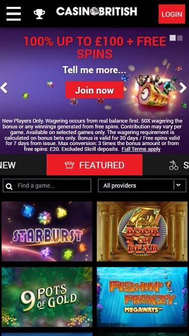 كازينو بريتش هو موقع مراهنات إلكتروني افتتح أبوابه عام ٢٠١٦، وتملكه وتديره شركة ProgressPlay Ltd. مع أن البعض قد يعتقد أن كازينو بريتش يستهدف سوق الألعاب في المملكة المتحدة، إلا أنه لا يتميز كثيرًا عن غيره، باستثناء وجود كلب بولدوغ إنجليزي في شعاره. يتميز كازينو بريتش بتصميم جيد ومكتبة ألعاب غنية، مما يجعله مكانًا مناسبًا للعب، حتى لو كانت شروط المكافآت مخيبة للآمال بعض الشيء.معلومات الكازينو