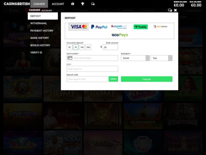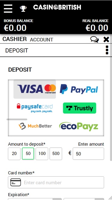 بالنظر إلى الشروط والأحكام في كازينو بريتيش، لا يوجد ما يُذكر يُعتبر غريبًا أو مُستغلًا للاعبين. النظام المصرفي في الكازينو جيد، مع الخيارات التالية المُتاحة: فيزا، ماستركارد، سكريل، نيتيلر، مايسترو كارد، آيديل، باي سيف كارد، والدفع عبر الهاتف. مدة الانتظار 72 ساعة، وهي أطول قليلًا مما نتمناه، وحد السحب الشهري المنخفض جدًا والبالغ 3000 دولار أمريكي أمرٌ مُفاجئ حقًا.خيارات الخدمات المصرفية في Casino British