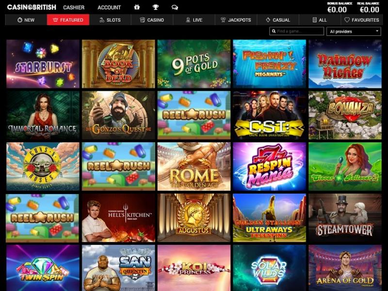 يقدم كازينو بريتيش عددًا من ألعاب الفيديو سلوتس، حيث تقدم الشركة مئات الألعاب من مايكروغيمينغ ونت إنت. كما يقدم العديد من الألعاب الأصلية، بالإضافة إلى العديد من ألعاب السلوتس المرخصة مثل تومب رايدر، وجوراسيك بارك، وتيرميناتور 2، وغيرها. ولمن يرغب في الفوز بجائزة كبرى، يُمكنه تجربة مجموعة ألعاب الجائزة الكبرى التراكمية التي يقدمها الكازينو، والتي يقدم العديد منها جوائز نقدية ضخمة تتراوح بين ستة وسبعة أرقام.برنامج نقاط المنافسة