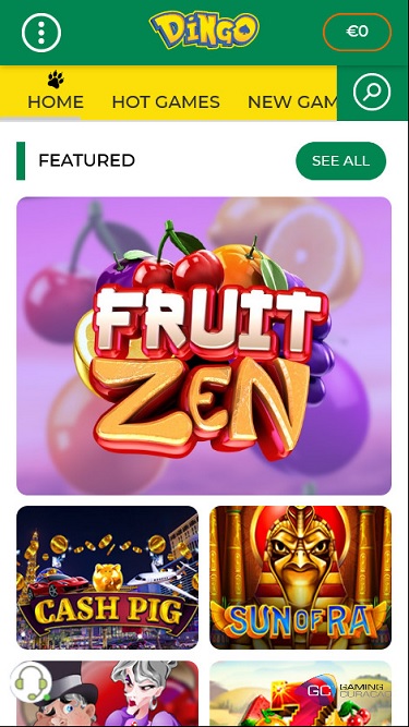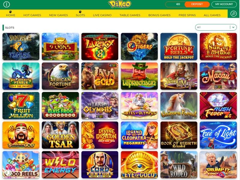كازينو دينغو مدعوم من Microgaming, BetSoft, 1x2gaming, Big Time Gaming, ELK Studios, Evolution Gaming, Ezugi, Habanero Systems, playson, Rabcat, Rival, SOFTSWISS, Thunderkick, Vivo Gaming, Yggdrasil, Wazdan, Booming Games, PlayPearls, BetConstruct, Pragmatic Play, Nolimit City, Red Tiger Gaming, Booongo, LuckyStreak, Spinomenal, Felix Gaming, Skillzzgaming, Fugaso, Kalamba, Revolver Gaming, Nucleus Gaming, Triple Edge Studios, BGAMING, Northern Lights Gaming, Evoplay, Stormcraft Studios, Switch Studios, SA Gaming, All41 Studios, TVBet, Gameburger Studios, Pulse 8 Studios, Neon Valley Studios, Swintt, Super Spade Games, TrueLab Games, SpinPlay Games, Real Dealer Studios, Holle Games, Caleta Gaming, Games Global, Blueprint Gaming, GameScale, Mr Slotty, Reel Time Gaming, betiXon, Iron Dog Studio, Old Skool Studios, Foxium, Just For The Win, Reflex Gaming, PearFiction Studios, Wild Streak Gaming, Slingshot Studios, Fortune Factory Studios, RubyPlay, 4ThePlayer, AvatarUX, ReelPlay, Alchemy Gaming, Black Pudding Games, Snowborn Games, Boomerang Studios, SimplePlay, Bang Bang Games, Half Pixel Studios, Dragon Gaming, Peter And Sons, Eurostar Studios and Aurum Signature Studios ، وتُقدم ألعاب الكازينو عبر منصة لعب فوري عبر الإنترنت، تُحمّل مباشرةً من خلال متصفح الإنترنت. يقدم الكازينو مجموعة ألعاب أقل من بعض منافسيه، لكن جودتها جيدة. كما يتوفر اللعب عبر الهاتف المحمول، مما يتيح للاعبين فرصة اللعب على هواتفهم الذكية أو أجهزتهم اللوحية.