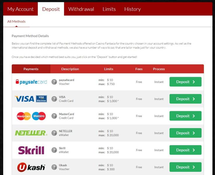 كازينو فانتازيا مدعوم بواسطة Microgaming, Net Entertainment, Evolution Gaming, Novomatic, Play'n GO, Games Global and Greentube ، وتُقدم ألعابه عبر منصة ويب. كما يتوفر كازينو جوال لمن يلعبون ألعاب الكازينو على الهواتف الذكية والأجهزة اللوحية.خيارات الخدمات المصرفية في Casino Fantasia
