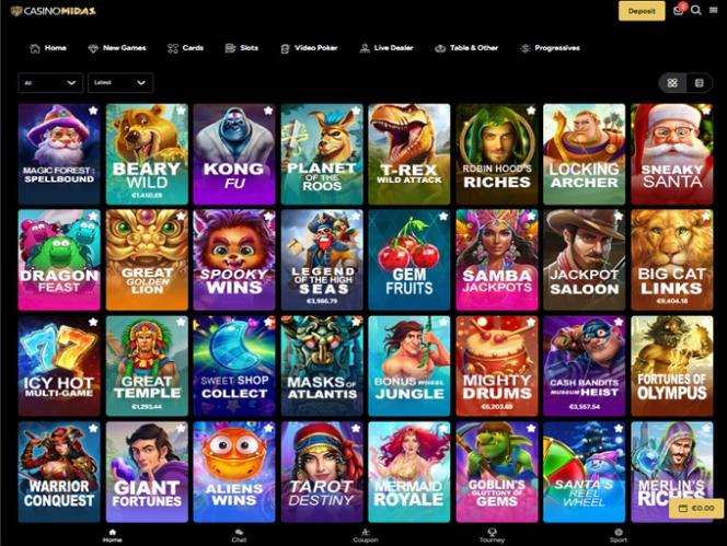 يُقدّم كازينو ميداس العديد من ألعاب السلوتس، حيث يُقدّم الكازينو عشرات من ألعاب الفيديو والسلوتس الكلاسيكية. بالإضافة إلى ذلك، تُقدّم سلسلة من الألعاب جوائز كبرى تصاعدية، تتراوح قيمتها بين عدة آلاف ومليون دولار.برنامج نقاط المنافسة