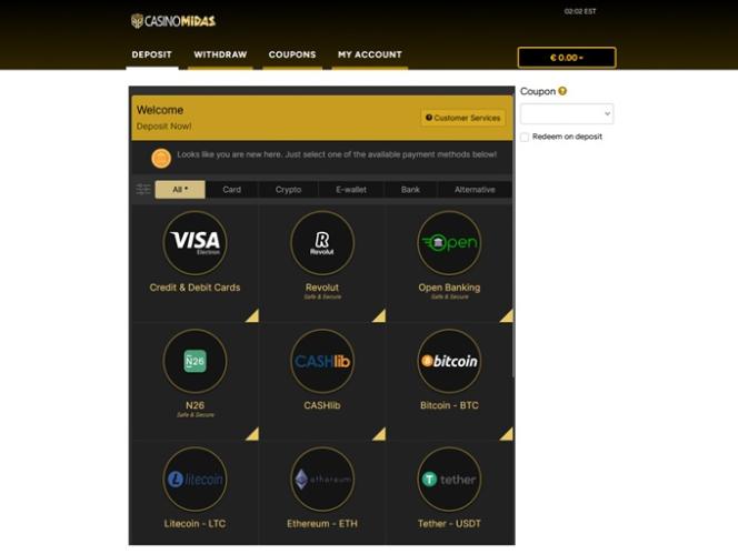 كازينو ميداس مدعوم من Real Time Gaming, Visionary iGaming and Spinlogic Gaming ، مما يتيح لك الوصول إلى مجموعة كاملة من ألعاب الكازينو. يمكنك الوصول إلى الكازينو عبر برنامج قابل للتنزيل، بالإضافة إلى منصة ويب تتيح لك اللعب عبر متصفح الويب.خيارات الخدمات المصرفية في Casino Midas