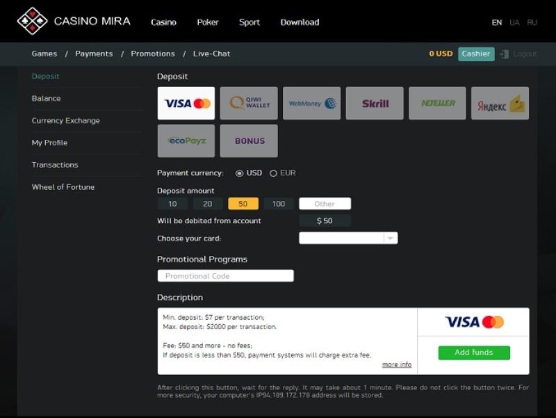 لا يقبل موقع Casino Mira اللاعبين من البلدان التالية: ألاباما, ألاسكا, أريزونا, أركنساس, كاليفورنيا, كولورادو, كونيتيكت, قبرص, دي سي, ديلاوير, فلوريدا, جورجيا, هاواي, أيداهو, إلينوي, إنديانا, أيوا, كانساس, كنتاكي, لاتفيا, لويزيانا, مين, ماريلاند, ماساتشوستس, ميشيغان, مينيسوتا, ميسيسيبي, ميسوري, مونتانا, نبراسكا, نيفادا, نيو هامبشاير, نيوجيرسي, نيو مكسيكو, نيويورك, كارولينا الشمالية, داكوتا الشمالية, أوهايو, أوكلاهوما, أونتاريو, أوريغون, بنسلفانيا, رود آيلاند, كارولينا الجنوبية, داكوتا الجنوبية, تينيسي, تكساس, ديك رومى, الولايات المتحدة, يوتا, فيرمونت, فرجينيا, واشنطن, ولاية فرجينيا الغربية, ويسكونسن و وايومنغ.