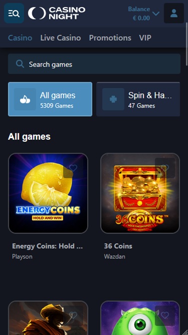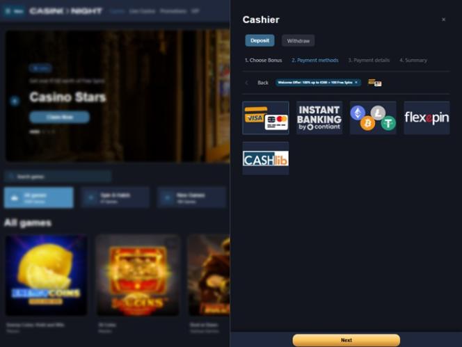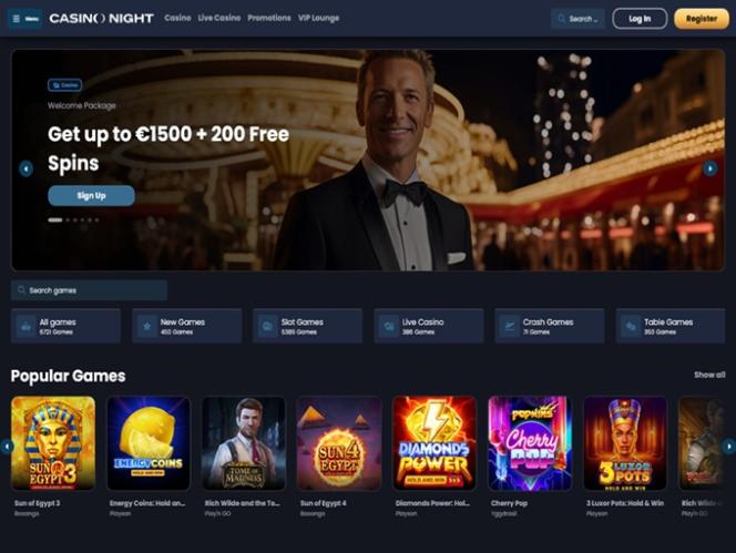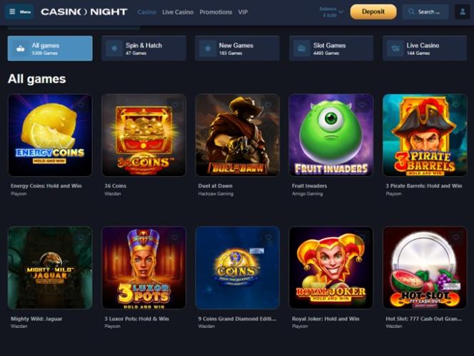 انطباعنا الأول هو أننا نزور كازينو إلكترونيًا أنيقًا وعصريًا يقدم مجموعة واسعة من الألعاب. منصة الكازينو مصممة خصيصًا للاعبين، وتدعم اللغتين الإنجليزية والفرنسية، مما يمنح اللاعبين المبتدئين والمحترفين على حد سواء تجربة ممتعة وترفيهية عالية الجودة في "ليلة الكازينو".