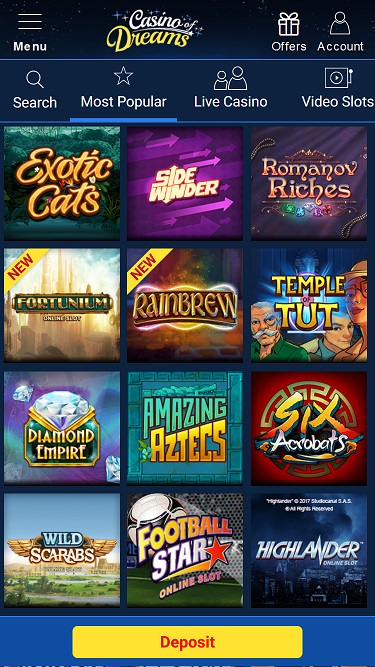 يتم تشغيل كازينو الأحلام بواسطة Microgaming, Genesis Gaming, Rabcat, Games Global and NextGen ، ويتم توفير ألعابه من خلال منصة اللعب الفوري المستندة إلى الويب بالإضافة إلى موقع الهاتف المحمول.