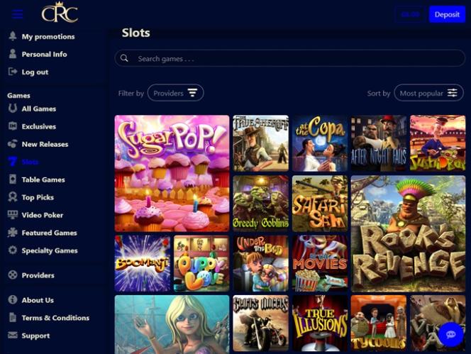 يقدم كازينو رويال كلوب تشكيلة واسعة من ماكينات القمار، بما في ذلك ماكينات الفيديو والماكينات الكلاسيكية. كما يقدم الكازينو مجموعة من الجوائز الكبرى التراكمية، بجوائز بملايين الدولارات متاحة للفوز بها في أي وقت.برنامج نقاط المنافسة