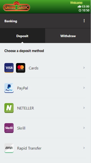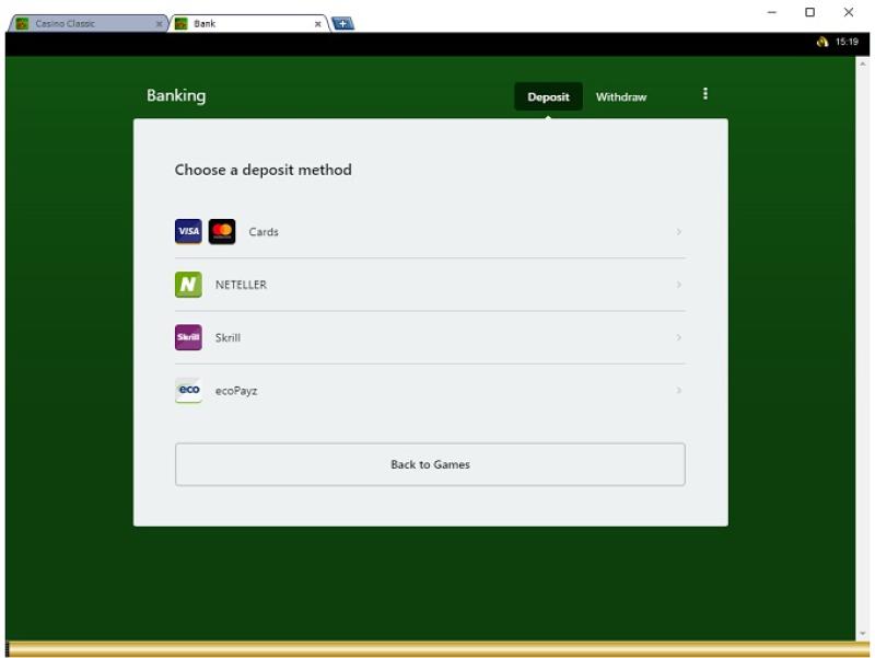 كازينو كلاسيك مدعوم من Microgaming, Evolution Gaming, Rabcat, Triple Edge Studios, Northern Lights Gaming, Stormcraft Studios, Electric Elephant Games, All41 Studios, Gameburger Studios, Pulse 8 Studios, Neon Valley Studios, SpinPlay Games, Real Dealer Studios, GONG Gaming, Buck Stakes Entertainment, Games Global, Old Skool Studios, Foxium, Just For The Win, PearFiction Studios, Slingshot Studios, Fortune Factory Studios, Crazy Tooth Studio, Alchemy Gaming, Snowborn Games, Gold Coin Studios, Half Pixel Studios, Eurostar Studios and Aurum Signature Studios ، مما يوفر مكتبة ضخمة من ألعاب الكازينو للاعبين عبر إصداري الكمبيوتر والهواتف المحمولة. يتوفر البرنامج بنسختين: اللعب الفوري، والتنزيل على جهاز الكمبيوتر.خيارات الخدمات المصرفية في Casino Classic