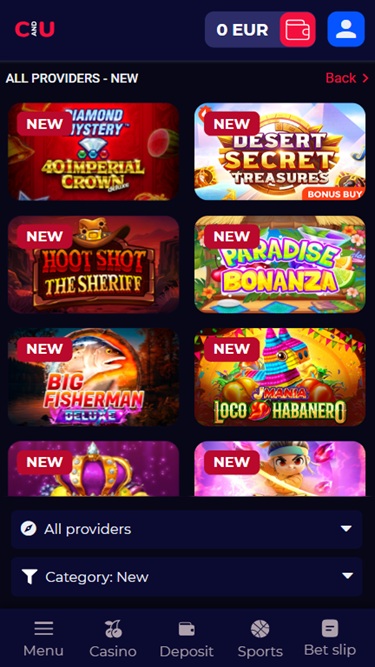 منذ لحظة دخولك إلى الموقع، يتضح لك أن CasinoAndYou لا يقتصر على الألعاب فحسب، بل يمنح اللاعبين أيضًا تحكمًا كاملاً في التجربة. يتميز الموقع بتصميم أنيق وجذاب، وواجهة مستخدم أنيقة وسهلة الاستخدام على الهواتف المحمولة، كما أنها سريعة الاستجابة على أجهزة الكمبيوتر المحمولة.