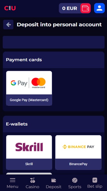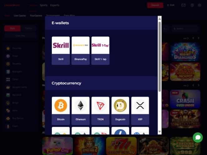 يدعم CasinoAndYou أكثر من 50 طريقة دفع، بما في ذلك بطاقات الدفع التقليدية مثل Visa وMastercard وSkrill وNeteller، بالإضافة إلى أكثر من 30 عملة مشفرة - بيتكوين، إيثريوم، لايتكوين، ترون، دوجكوين، USDT، وغيرها الكثير. كما يدعم حلول الدفع المحلية مثل Papara وJeton لتسهيل الأمور على اللاعبين المحليين.
