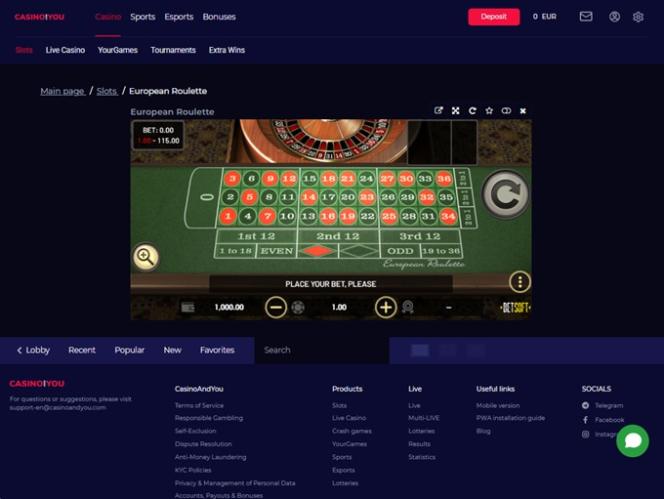 - يقدم CasinoAndYou حدًا أدنى منخفضًا للإيداع والسحب، مما يجعله متاحًا لجميع اللاعبين، بغض النظر عن ميزانيتهم. لن تحتاج إلى إيداع مبالغ كبيرة لبدء اللعب، بل يمكنك سحب حتى الأرباح الصغيرة بسهولة ويسر.