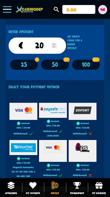 بالنسبة لخيارات الدفع، يمكنك اختيار الإيداع باستخدام بعض خيارات الدفع الأكثر شيوعًا، مثل فيزا، وسكريل، وماستركارد، وجيتون، وباي آي دي، وغيرها الكثير . كما يمكنكالدفع بالعملات المشفرة . هذا التنوع في خيارات الدفع أمرٌ نتطلع إليه بشدة.