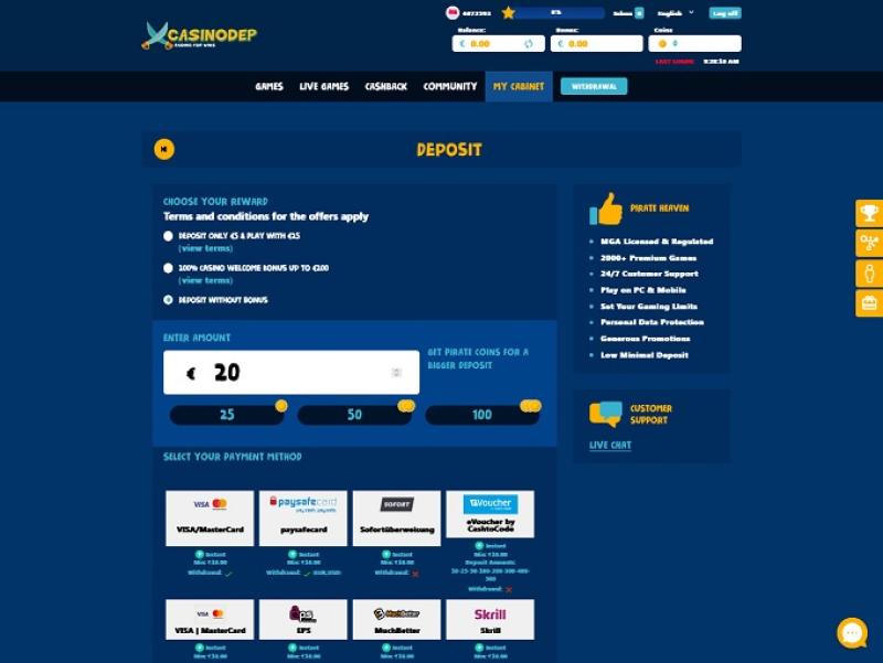 أما بالنسبة لخدمة العملاء، فيمكنك التواصل بسهولة مع أحد ممثلي CasinoDep عبر البريد الإلكتروني أو الدردشة أو نظام المراسلة الخاص بهم. بناءً على خبرتنا، يمكننا القول بثقة إنهم سريعو الاستجابة ومتعاونون للغاية . وهذه ميزة كبيرة لنا.