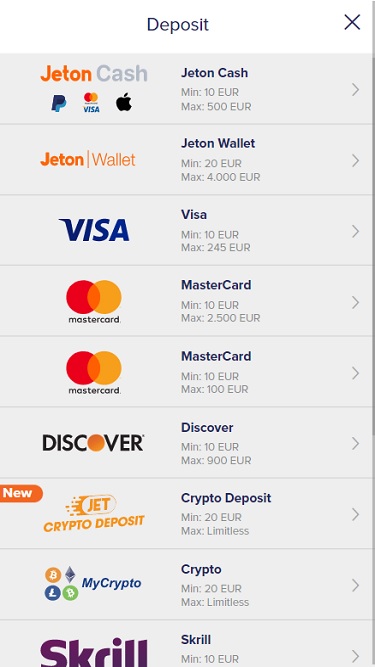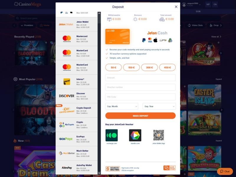 لنتحدث الآن عن خيارات الدفع. عند اللعب على كازينو ميجا، يمكنك اختيار الإيداع باستخدام بعض الخيارات الأكثر شيوعًا مثل فيزا، وماستركارد، وجيتون، وباي سيف كارد، وسكريل، وغيرها الكثير. كما يتوفر خيار إيداع الأموال عبر نيتيلر ، وهو خيار شائع جدًا لدى العديد من اللاعبين في السنوات الأخيرة.