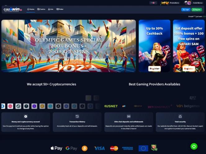 يعرض CazWin أيضًا أحدث الفائزين في المنصة، بالإضافة إلى قائمة واسعة من مزودي البرامج الرائدين في هذا المجال. يحتوي أسفل الصفحة الرئيسية على جميع الأقسام الأساسية، مثل المقامرة المسؤولة، والشروط والأحكام، ودعم العملاء، وسياسة الخصوصية.