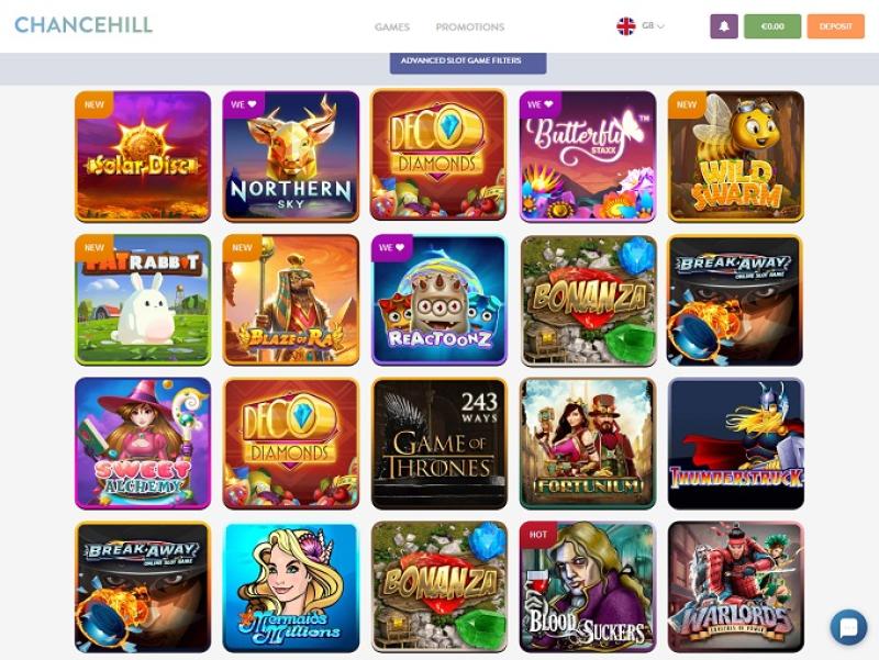 كازينو Chance Hill هو موقع مراهنات عبر الإنترنت افتتح أبوابه لأول مرة في عام 2015. يقع كازينو Chance Hill في إسبانيا ومرخص في كوراساو وقد نال استحسان مستخدميه، الذين يثنون على مكتبة الألعاب الضخمة في الكازينو بالإضافة إلى أوقات الدفع السريعة للغاية وإدارة الكازينو الممتازة.