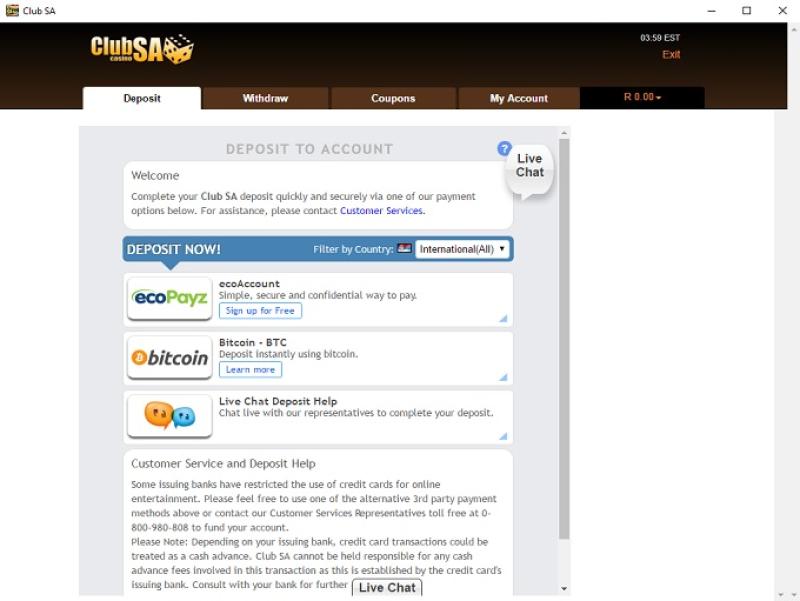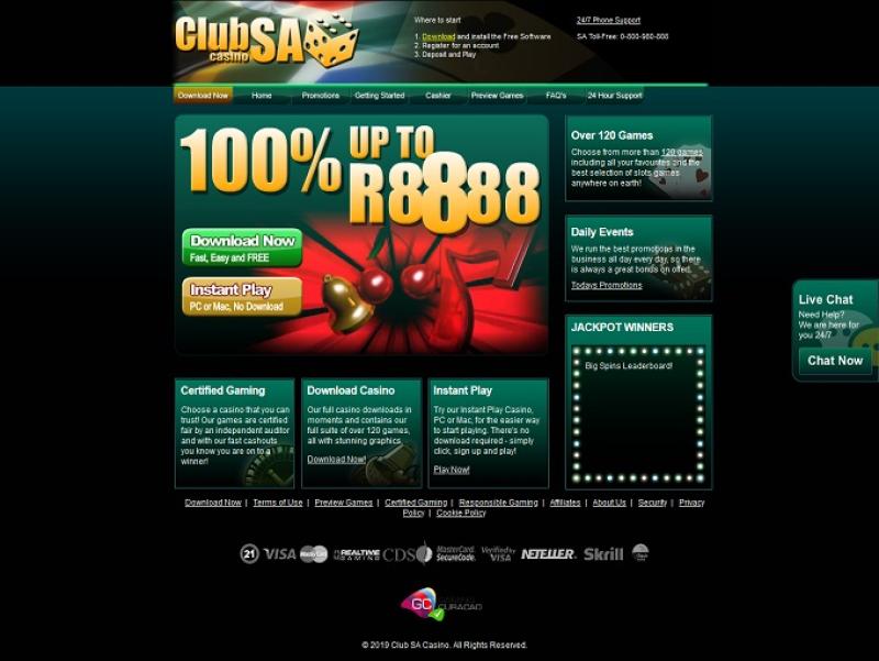 كازينو Club SA مملوك لمجموعة كازينو Club World (CWC)، وهي شركة تعمل في هذا المجال منذ عام ٢٠٠٤. تشتهر المجموعة بمكافآتها السخية على ولائهم. يستهدف الكازينو السوق الجنوب أفريقية، ويسمح باللعب بالراند الجنوب أفريقي فقط. في الواقع، يُحاكي الكازينو Club World/Club USA من جميع النواحي، بدءًا من العروض الترويجية ووصولًا إلى برنامج Real Time Gaming. أُدرج الموقع على قائمتنا السوداء، نظرًا لتورط Club World في ممارسات غير قانونية خلال العام الماضي. ويعود ذلك إلى تغيير إداري ثبت أنه غير منصف للاعبين والشركاء على حد سواء. ونتيجةً لذلك، نحث اللاعبين على البحث عن كازينو آخر.