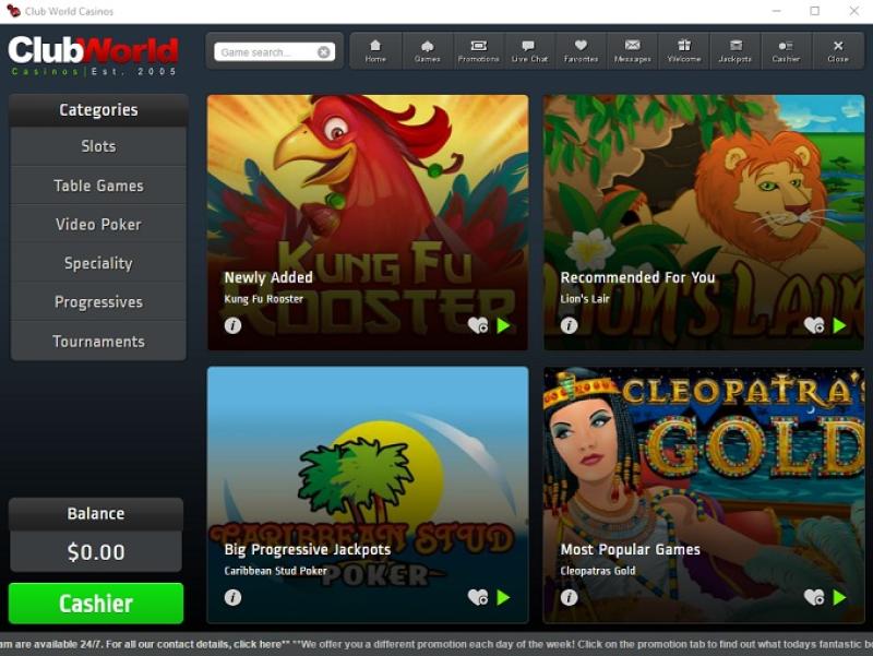 كازينو كلوب وورلد مملوك لمجموعة كازينو كلوب وورلد (CWC). إذا كنت تسجل دخولك من الولايات المتحدة، فسيتم توجيهك إلى كلوب يو إس إيه. تعمل هذه المجموعة منذ عام ٢٠٠٤، بينما يتواجد كلوب وورلد/كلوب يو إس إيه على الساحة منذ عام ٢٠٠٩. فيما يتعلق بكازينوهات Real Time Gaming، لا يوجد أفضل من هذه المجموعة، مع خدمة عملاء ممتازة ومكافآت دورية للاعبين المخلصين.