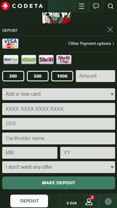 خيارات الخدمات المصرفية في Codeta Casino