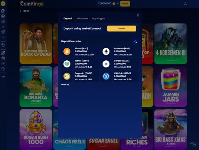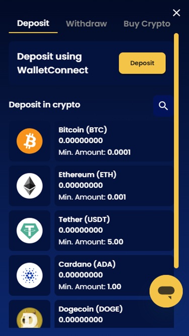 هذه منصة مقامرة مخصصة للعملات المشفرة فقط، ما يعني عدم توفر طرق دفع تقليدية للاعبين لإيداع وسحب الأموال. العملات المشفرة المتاحة هي: بيتكوين ، كاردانو ، دوجكوين ، إيثريوم ، لايتكوين ، تيثر ، ترون ، و USD Coin .