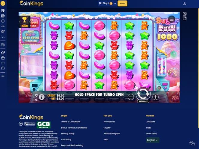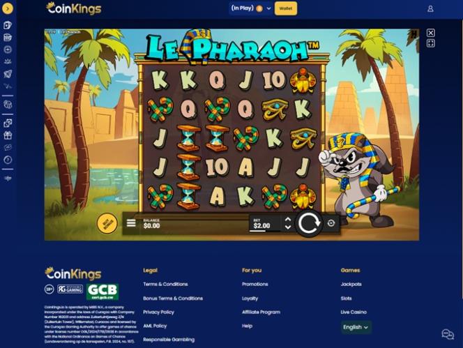 في أسفل الصفحة الرئيسية، يُمكن للمستخدمين الوصول إلى أهمّ المعلومات المتعلقة بعلامة CoinKings التجارية، مثل شروط الخدمة، والمقامرة المسؤولة، وسياسة الخصوصية، وشروط المكافآت. ويُمكن للاعبين أيضًا تغيير لغة الموقع.