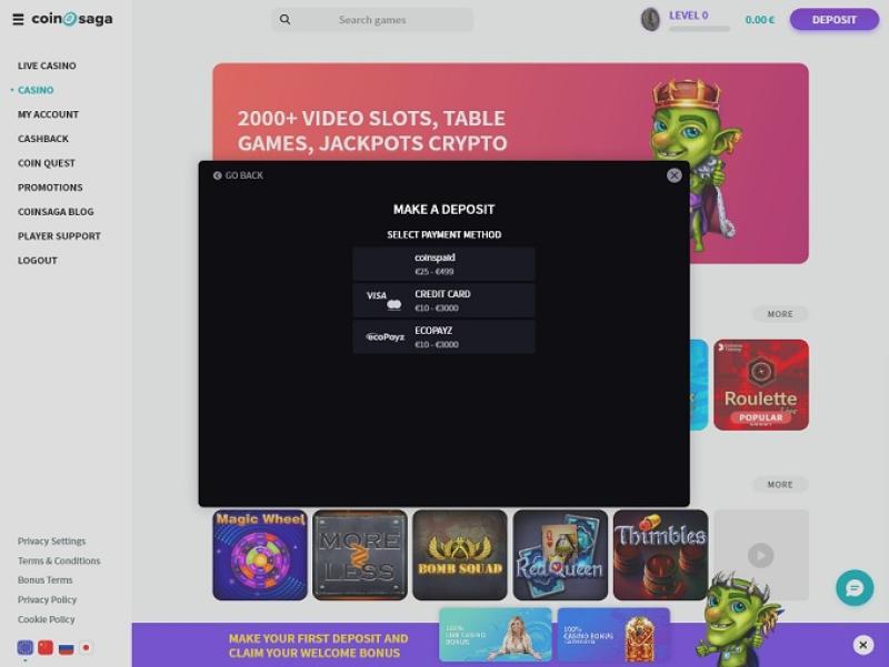 كازينو كوين ساغا هو كازينو إلكتروني يدعم العملات المشفرة ويقبل بيتكوين . عمليات السحب مجانية، وسيتم تحويلها إلى حسابك عبر طريقة الإيداع الأولية. في حال عدم توفر هذه الطريقة، سيتم تحويل المبلغ عبر أي طريقة دفع أخرى استخدمتها سابقًا. قد تطلب منك الشركة تقديم مستندات لإجراءات "اعرف عميلك" إذا تجاوز مبلغ السحب 1000 دولار أمريكي.خيارات الخدمات المصرفية في CoinSaga Casino