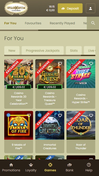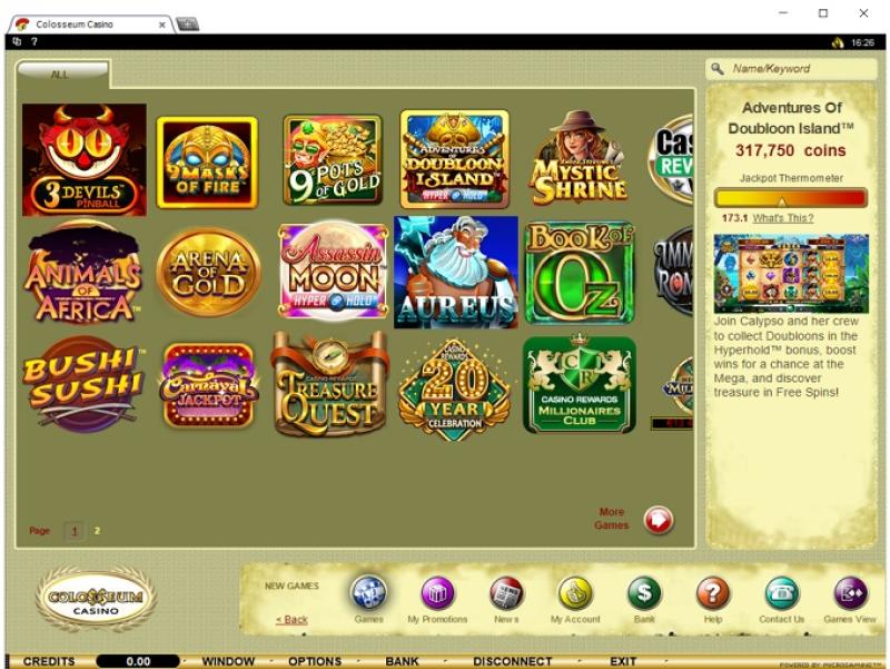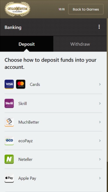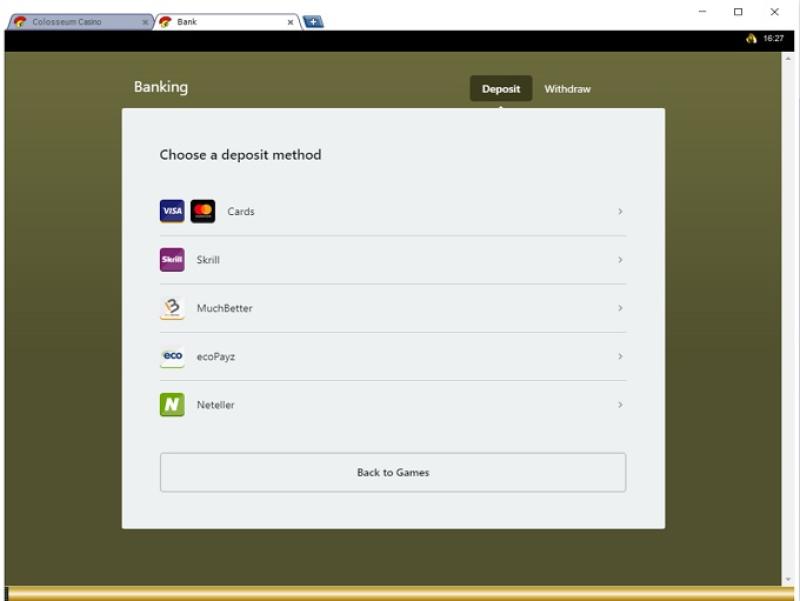 يعمل كازينو كولوسيوم بواسطة Microgaming, Evolution Gaming, Pragmatic Play, Triple Edge Studios, Northern Lights Gaming, Stormcraft Studios, Switch Studios, All41 Studios, Gameburger Studios, Pulse 8 Studios, Neon Valley Studios, SpinPlay Games, Real Dealer Studios, GONG Gaming, On Air Entertainment, Buck Stakes Entertainment, Games Global, Old Skool Studios, Foxium, Just For The Win, PearFiction Studios, Wild Streak Gaming, Slingshot Studios, Fortune Factory Studios, Crazy Tooth Studio, Alchemy Gaming, Snowborn Games, Gold Coin Studios, Half Pixel Studios, Eurostar Studios, Aurum Signature Studios, Area Vegas, Wishbone Games, Circular Arrow, HammerTime Games, INO Games, Nailed It! Games, Neko Games, Reel Kingdom and Oros Gaming ، مما يوفر له مكتبة تضم مئات الألعاب. يُمكن الوصول إلى الكازينو عبر منصة ويب، بالإضافة إلى برنامج قابل للتنزيل، يسمح لك بتثبيت البرنامج مباشرةً على جهازك.خيارات الخدمات المصرفية في Colosseum Casino