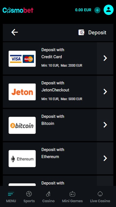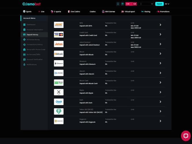خيارات الخدمات المصرفية في Cosmobet Casino
