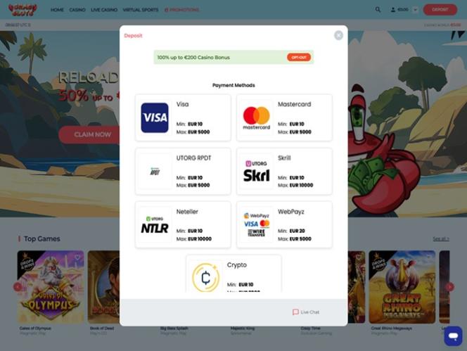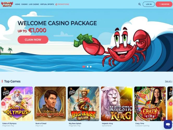 عند فتح الموقع، ستُستقبل بواجهة زرقاء فاتحة مريحة للعين، وبالطبع، سلطعون. أعلى يسار الصفحة مخصص لقائمة "الرئيسية"، والكازينو، والكازينو المباشر، والرياضات الافتراضية، والعروض الترويجية. على الجانب الآخر - يمين الصفحة - ستجد رصيد حسابك وقائمة الإيداع، أو أزرار تسجيل الدخول/التسجيل إذا لم تكن قد سجلت دخولك بعد.