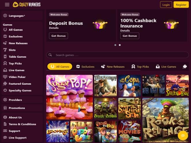 كازينو CrazyWinners مدعوم من BetSoft, Genesis Gaming, Rival, Saucify, Arrows Edge, Radi8 Games, Fresh Deck Studios, Qora Games, Genii, Dragon Gaming and Dragoon Soft ، والذي يوفر ألعابه عبر منصة ويب. كما يتوفر للكازينو موقع جوال يتيح للاعبين الوصول إلى الألعاب عبر الهواتف الذكية والأجهزة اللوحية.
