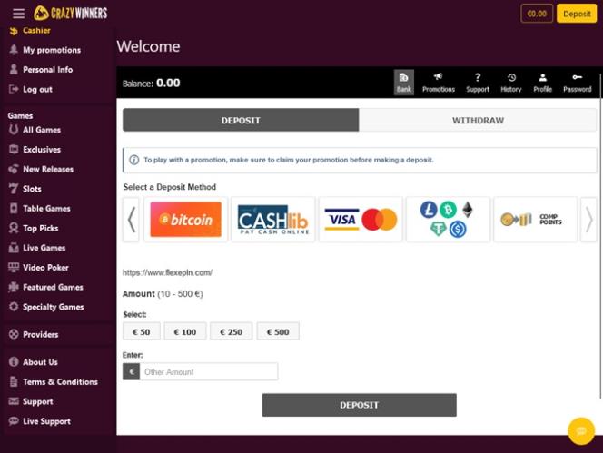 لا يبدو أن كازينو CrazyWinners يقدم نقاطًا مجانية للاعبيه في الوقت الحالي.