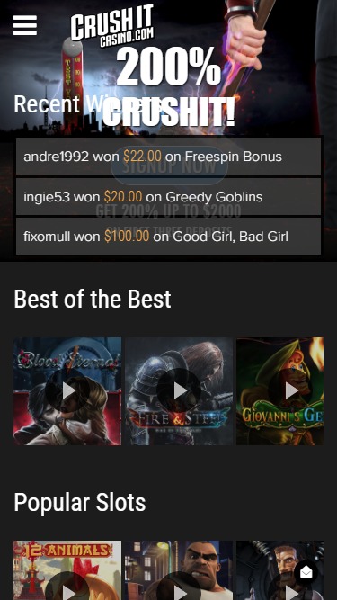 يقدم كازينو Crush It أكثر من 200 لعبة فيديو سلوتس مختلفة. يمكن لعب العديد من هذه الألعاب على الأجهزة المحمولة، وجميعها على أجهزة الكمبيوتر. تتميز الألعاب بمجموعة متنوعة من السمات والميزات، ولا شك أنك ستقضي وقتًا طويلاً في تصفح المكتبة. تتوفر جوائز كبرى تصاعدية، ولكن لا تحاول الفوز بها. يحتوي الموقع على العديد من جوائز BetSoft التصاعدية، والتي ثبت عدم إمكانية الفوز بها. من الأفضل الالتزام بمراهنات أقل وتجنب المخاطرة بهذه الجوائز الكبيرة.