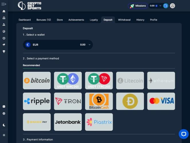 يدعم كازينو Crypto Bet Sports خيارات الخدمات المصرفية بالعملات المشفرة الشائعة فقط: