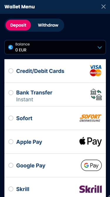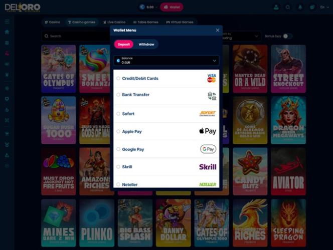 كما ذكرنا سابقًا، يدعم كازينو ديل أورو العديد من العملات المشفرة. بالإضافة إلى العملات الرقمية ومحافظ العملات المشفرة ، يمكن للاعبين استخدام طرق الدفع التقليدية، بما في ذلك التحويلات البنكية، وبطاقات الخصم والائتمان، وباي بال، وسكريل، وغيرها من المحافظ الإلكترونية الشائعة وخيارات الدفع عبر الإنترنت.