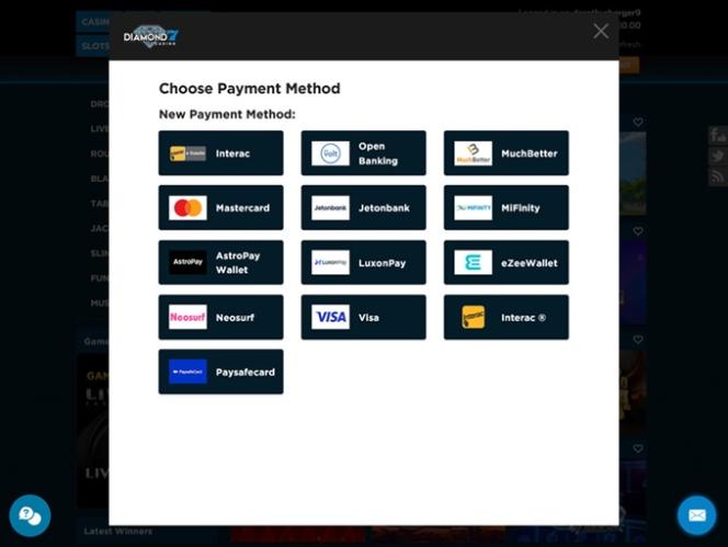 كازينو Diamond7 مدعوم من Microgaming, Net Entertainment, 1x2gaming, Barcrest, Big Time Gaming, ELK Studios, Evolution Gaming, EYECON, Ezugi, lightningboxgames, Novomatic, Oryx, Play'n GO, Rabcat, Relax Gaming, Thunderkick, Wazdan, Realistic Games, Booming Games, Stakelogic, Pragmatic Play, Nolimit City, Felt Gaming, Red Tiger Gaming, IGT, Spinomenal, Fantasma Games, SYNOT Games, Kalamba, Revolver Gaming, Skywind, Spinmatic, Triple Edge Studios, BGAMING, Northern Lights Gaming, Stormcraft Studios, Electric Elephant Games, Pocket Games Soft, All41 Studios, Gameburger Studios, Pulse 8 Studios, Neon Valley Studios, Golden Rock Studios, Spearhead Studios, Swintt, SpinPlay Games, HungryBear Gaming, GONG Gaming, Blue Guru Games, Lady Luck Games, On Air Entertainment, Buck Stakes Entertainment, Design Works Gaming, Games Global, 2by2 Gaming, Ainsworth, Blueprint Gaming, Endemol Games, Greentube, Leander Games, Merkur Gaming, NextGen, Push Gaming, Tom Horn Gaming, Inspired Gaming, Gaming Realms, SG Interactive, Red7Mobile, Scientific Games, Reel Time Gaming, Authentic Gaming, Iron Dog Studio, Old Skool Studios, Foxium, Just For The Win, Storm Gaming Technology, PearFiction Studios, Apollo Games, Wild Streak Gaming, Slingshot Studios, Fortune Factory Studios, Jade Rabbit Gaming, 4ThePlayer, AvatarUX, Gamevy, Crazy Tooth Studio, NetGaming, High 5 Games, ReelPlay, AGS Interactive, Alchemy Gaming, Black Pudding Games, Snowborn Games, Hacksaw Gaming, Max Win Gaming, Gold Coin Studios, SilverBack Gaming, Peter And Sons, Eurostar Studios, Aurum Signature Studios, Armadillo Studios, Lucksome Gaming, Area Vegas, RAW iGaming, Leap Gaming, Wishbone Games, Spribe, Print Studios, HammerTime Games and Four Leaf Gaming ، وتتوفر الألعاب عبر منصة ويب. كما يوفر الكازينو موقعًا للهواتف المحمولة لمن يرغبون في اللعب على أجهزتهم اللوحية أو الهواتف الذكية.خيارات الخدمات المصرفية في Diamond7 Casino
