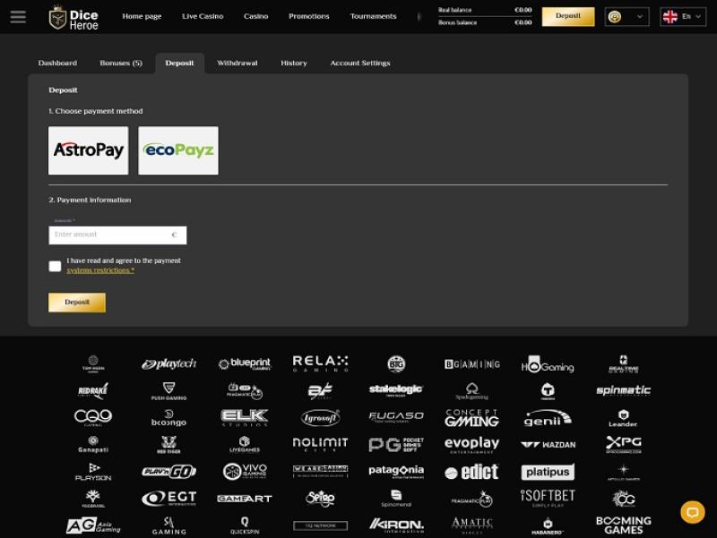 خيارات الخدمات المصرفية في DiceHeroe Casino