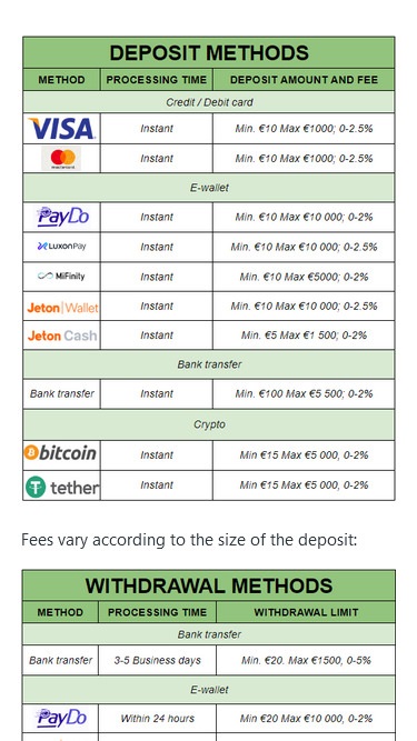 فيما يتعلق بخيارات الدفع، يوفر مشغل هذه العلامة التجارية للاعبين طرقًا تقليدية وحديثة لإيداع وسحب أموالهم. بالنسبة للطرق التقليدية، يمكن للاعبين استخدام Astropay، والتحويل البنكي، و Visa ، وMastercard ، و MiFinity ، وJeton ، و Neosurf ، و eZeeWallet . أما بالنسبة للطرق الحديثة، فيمكن للمقامرين اختيار العملات المشفرة مثل Bitcoin و Tether .