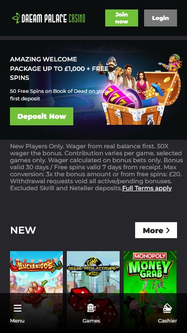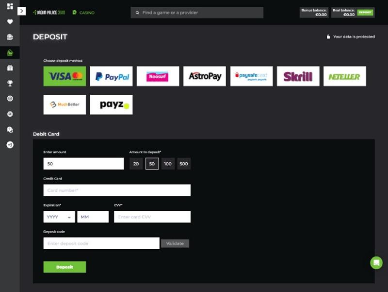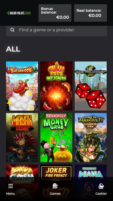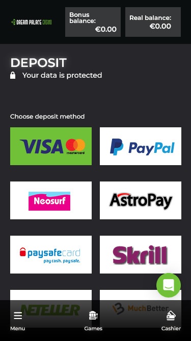 كازينو دريم بالاس مُشغّل بواسطة Microgaming, Net Entertainment, 1x2gaming, Barcrest, Big Time Gaming, ELK Studios, Evolution Gaming, EYECON, lightningboxgames, Play'n GO, Rabcat, Thunderkick, Nolimit City, Red Tiger Gaming, Spinomenal, Skywind, Triple Edge Studios, Northern Lights Gaming, Stormcraft Studios, Switch Studios, All41 Studios, Gameburger Studios, Pulse 8 Studios, Neon Valley Studios, Shuffle Master, SpinPlay Games, Real Dealer Studios, GONG Gaming, On Air Entertainment, Buck Stakes Entertainment, Games Global, Blueprint Gaming, NextGen, ProgressPlay, Tom Horn Gaming, WMS, Inspired Gaming, SG Interactive, Red7Mobile, CORE Gaming, Scientific Games, Reel Time Gaming, Iron Dog Studio, Old Skool Studios, Foxium, Just For The Win, PearFiction Studios, Slingshot Studios, Fortune Factory Studios, Gamevy, Crazy Tooth Studio, Alchemy Gaming, Black Pudding Games, Snowborn Games, Hacksaw Gaming, SimplePlay, Gold Coin Studios, Half Pixel Studios, Aurum Signature Studios and Lucksome Gaming ، مما يمنحه مكتبة متنوعة تضم مئات الألعاب. يُمكن الوصول إلى الكازينو عبر منصة ويب، ويمكن للاعبين أيضًا الوصول إليه عبر أجهزتهم المحمولة.خيارات الخدمات المصرفية في Dream Palace Casino