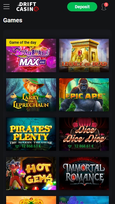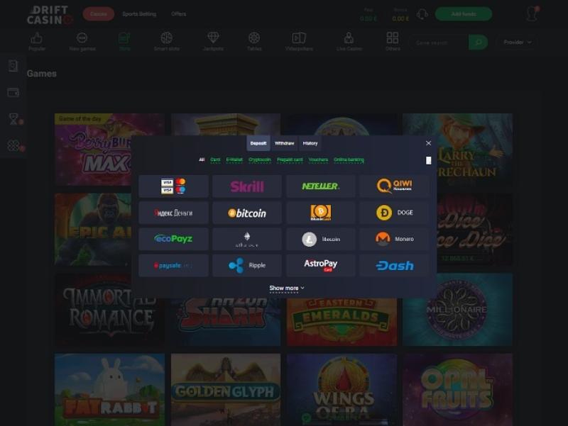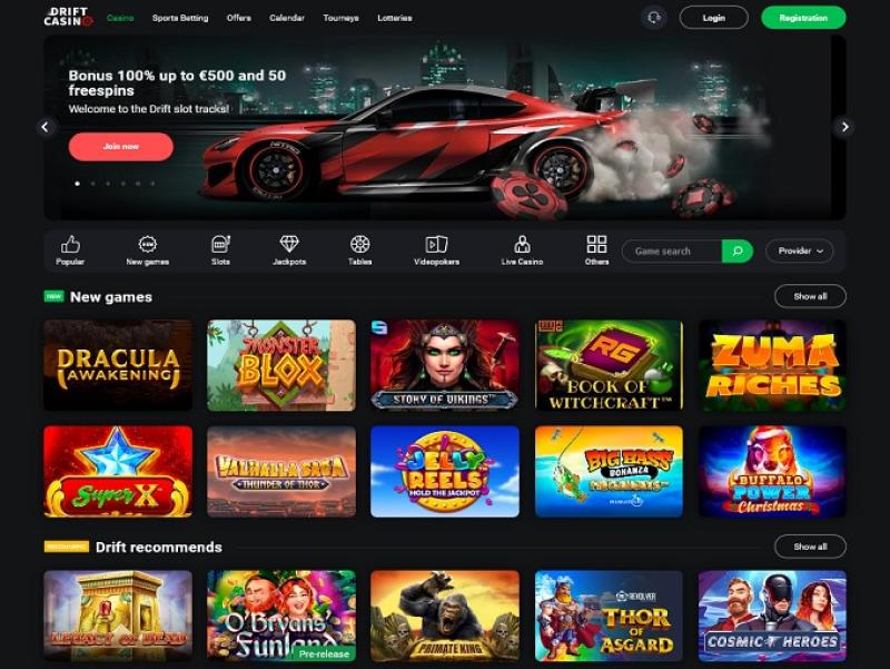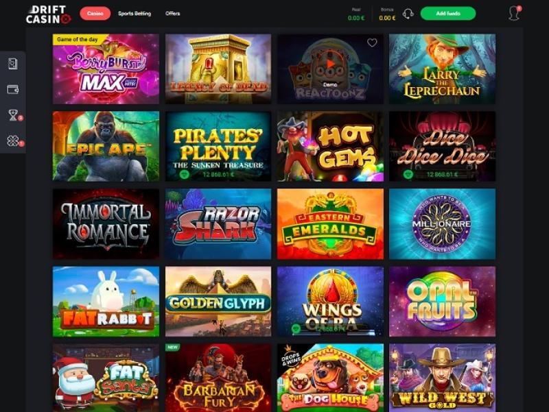 يقدم كازينو دريفت مئات من ألعاب الفيديو وألعاب السلوتس الكلاسيكية، حيث يقدم الموقع ألعابًا من مطورين رائدين مثل مايكروغيمينغ ونت إنت. كما يقدم الموقع مجموعة متنوعة من الجوائز الكبرى التراكمية، بما في ذلك جوائز ميجا مولاه وماجور مليونز. كما يدعم الكازينو ألعاب الجوال، ما يتيح لك لعب السلوتس من أي مكان يتوفر فيه اتصال بالإنترنت.